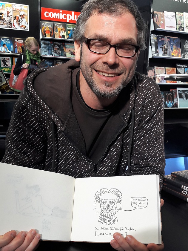 Beim Comicgemeinschaftsstand solltet ihr eh vorbeischauen. Dort sitzt eigentlich auch fast immer jemand, die/der zeichnet und signiert. Und es gibt Infos über die Signierstunden, also – vorbeischauen!