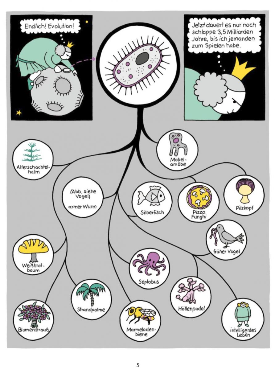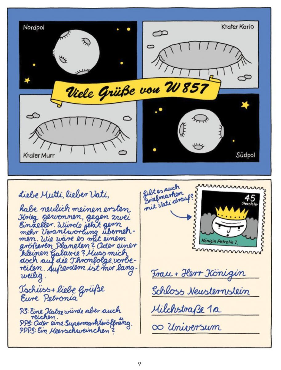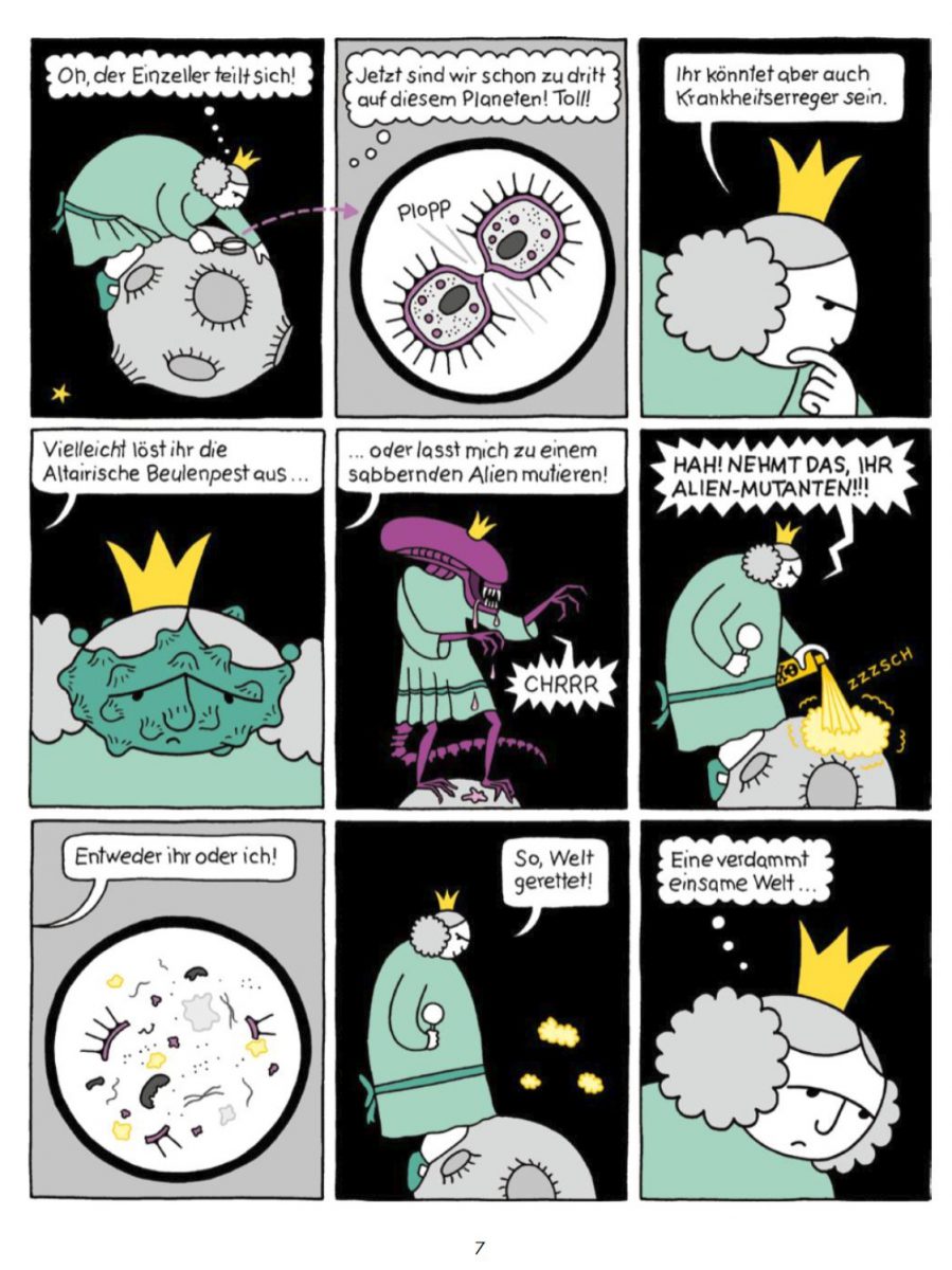 Greves Petronia fühlt sich vom Universum diskriminiert, hat keine Lust den Klischees zu entsprechen. Bevor sie rosa Kleidchen trägt, stirbt sie lieber. Und auf einen Ball gehen zu müssen, entfacht Alpträume in ihr. Damit hat sie sich allerdings schon in mein Herz geschlichen. In meist ein-seitigen Strips unter Anleihen von Bekanntem, wie Märchen, Werbeflyern von großen Elektronikhandelsketten und Science Fiction-TV-Serien, begleiten wir Lesenden die miesepetrige Prinzessin. Jeweils auf der linken Hälfte einer Doppelseite findet sich eine Weisheit im Stile Petronias – pragmatisch und oft schlecht gelaunt. Hervorragend.