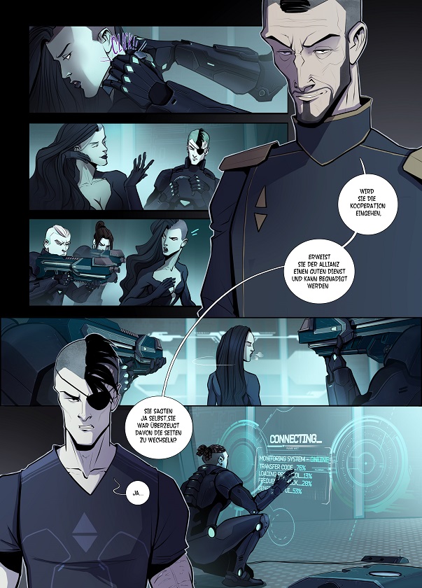 Und damit sind wir eigentlich auch bei meinem Lieblingsmotiv angelangt – SciFi-Designs! Innen und Außenarchtiktur, Hologramme, Waffen, aber gerade mechanische und technische Objekte sind meine absolute comfort zone! Ich könnte stundenlang Technik designen und mich in den Details verlieren – Schrauben, Klappen, Scharniere, Kabel – ich kann manchmal gar nicht aufhören, Objekte mit diesen Details auszuschmücken, seien es Raumwände oder doch nur ein Helm. Am liebsten zeichne ich meine Antagonisten – also die Rebellen, da sie fast allesamt Cyborgs sind und ich haufenweise mechanische Arme und Beine entwerfen kann. Und natürlich zeichne ich auch sehr gerne Tom – den Hauptcharakter – am liebsten in seiner Rüstung, mit Helm und Waffe, um meine Vorliebe für die technischen Details komplett auszuleben.